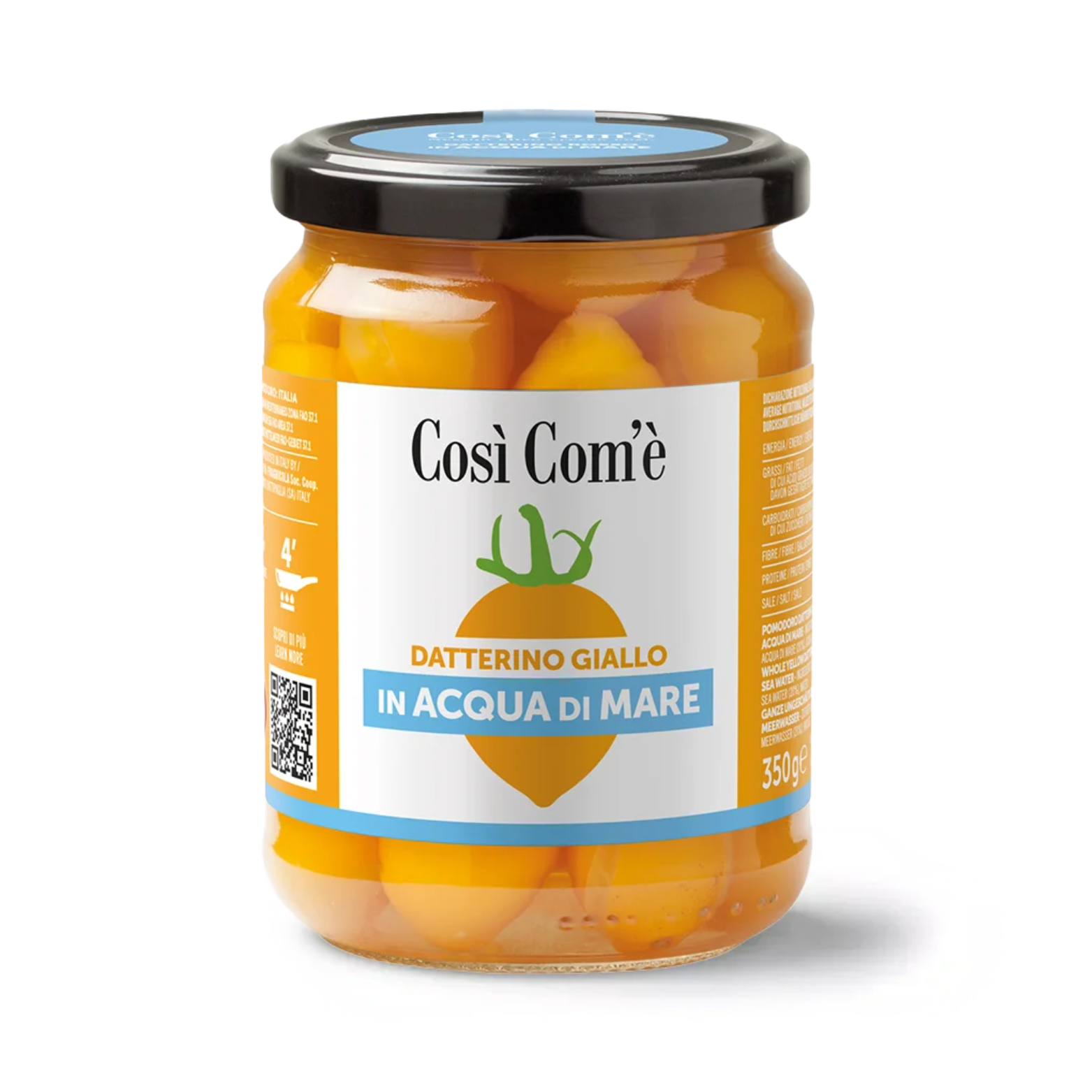 Zutaten: Gelbe „Datterini“-Tomaten (italienischer Herkunft aus integriertem Anbau), Meerwasser (20 %), Wasser.
