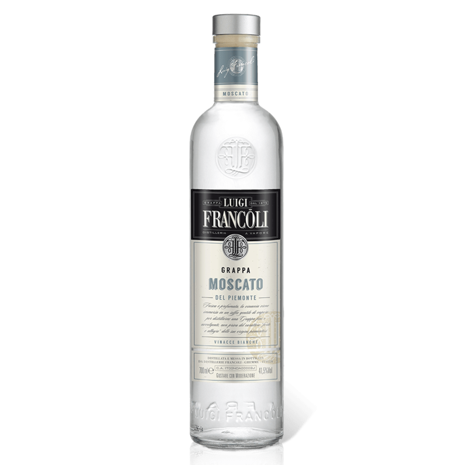 Der Francoli Moscato del Piemonte besticht durch sein reiches und feines Aroma sowie seine starke Präsenz. Sein Charakter ist sanft und zeichnet sich durch eine komplexe aromatische Struktur aus. Geschmacksnuancen wie der typische Muskat-Ton, der von der Traube stammt, sowie Nuancen von Zitrone, Maiglöckchen, Orange und Holunder machen sich bemerkbar. Dieser wunderschöne Grappa verwöhnt seinen Genießer auf sehr weiche und geschmeidige Weise und vermag es regelrecht, ihn zu verwöhnen.